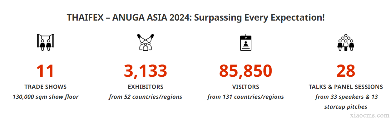 2024年THAIFEX展出面積13萬平方米,共有來自52個國家的3133家參展公司,排名前5的國家是中國、韓國、馬來西亞、越南和土耳其,其他還包括巴西、意大利、日本、挪威、波蘭等展團,他們在為期5天的泰國亞洲食品展(THAIFEX Anuga Asia)中向前來觀展的觀眾展示其產品并提供服務。在全球對泰國食品飲料的喜愛的推動下,共有131個國家的85850名專業觀眾出席。THAIFEX的主要目標是促成即刻訂單交易,交易預計將超過700億泰銖,其中線上采購預計將超過15億泰銖。