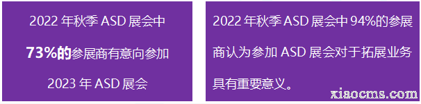 2021年秋季拉斯維加斯消費品正常開展,由于疫情中國企業(yè)未能參展,2022年春季,中國企業(yè)有數(shù)十家到場,隨著國外政策的放開及中國外貿(mào)企業(yè)尋求走出去的迫切心情,2022年秋季近40家中國企業(yè)線下出展,反應(yīng)良好。2023年春季ASD約有200家中國企業(yè)參加,取得很好的效果!