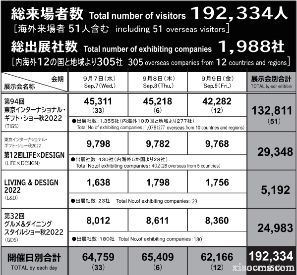 (1) 日本最大的家庭用品國際貿易展覽會東京國際禮品展是日本最大的貿易展覽,由八個高度專業化的類別和大約50個展覽會組成,并提供各種“衣服,食物,房屋和娛樂設施”,為您的生活增添色彩。新產品將匯集在一起。